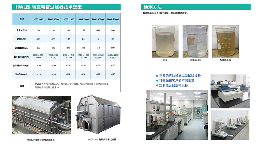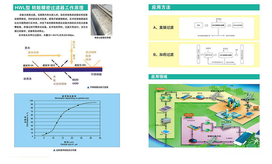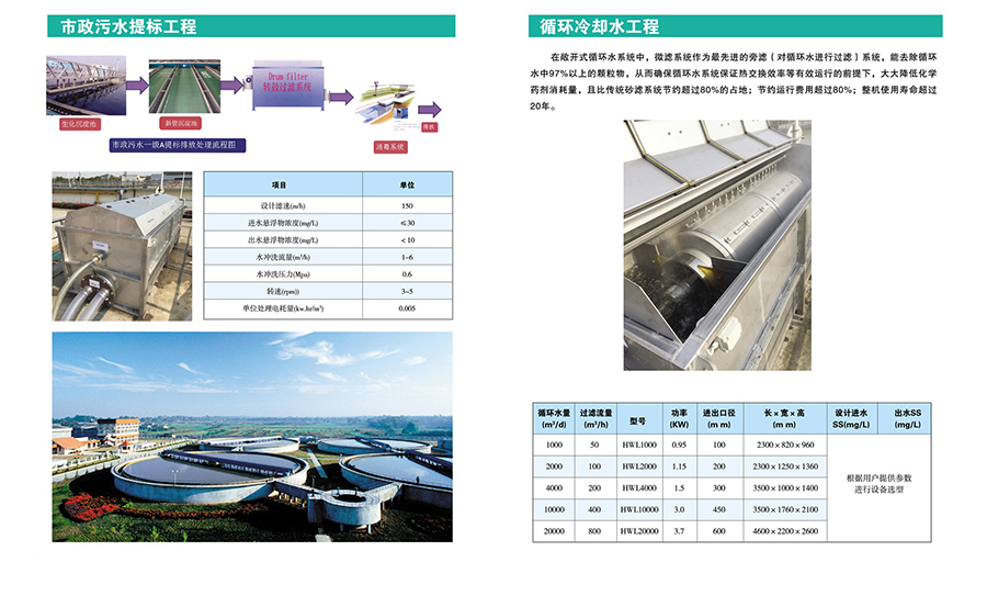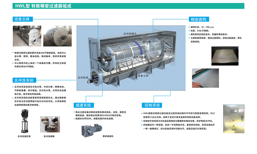 設備為連續過濾,當滾筒內有水進入時,自控系統將啟動驅動系統驅動滾筒轉動,同時啟動反沖洗泵。滾筒開始緩慢轉動,反沖洗泵抽取濾后出水對濾網進行反沖洗。沖洗下來的顆粒物質由設備內部的反沖洗水收集槽收集,并通過排污管排出設備。反沖洗的同時,過濾正常運行。當無水通過設備時,設備將自動停止。