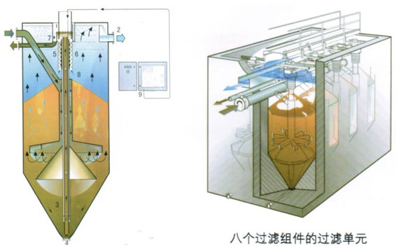 活性砂過濾器采用逆流原理。待處理的水從設備底部的入流分配管(1)流入,向上流經濾床而被過濾,然后向頂部的濾液出流口(2)流出。含有待處理雜質的濾砂從設備錐形底部(3)被空氣提升泵(4)提升到頂部的濾砂清洗器(5)。濾砂的清洗在提升泵中就已經開始,在紊流混合作用下雜質從砂粒中分離出來,臟砂從泵的出口溢出并進入清洗器曲徑通道(6),在那里砂被小流量的清水逆流沖洗干凈,雜質通過洗砂水出口(7)排出,而清洗后的砂粒(較重)又返回砂床(8)。結果是砂床在設備中不斷的做緩慢下沉運動。提升泵用壓縮空氣通過空氣分配器提供(9)水的凈化與砂的清洗同時進行,因而過濾器可以不受干擾地連續進行。