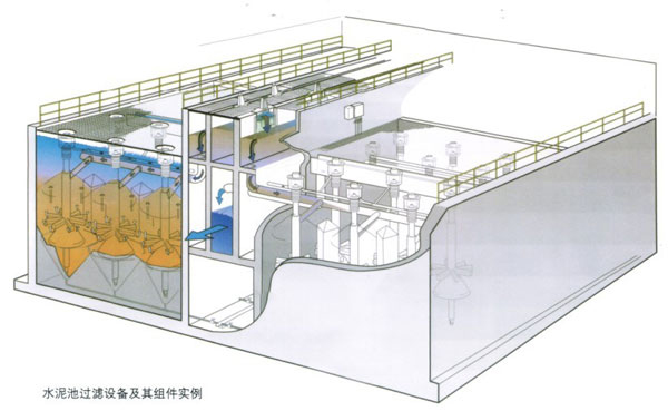 這種類型的過濾器安裝時,所有過濾單元(每個單元由多個過濾組件組成)公用一個砂床。一套設備實質上沒有過濾面積限制,因此活性砂過濾器可以應用在處理相當于10萬或更多人口用水的大型水廠和污水處理廠。